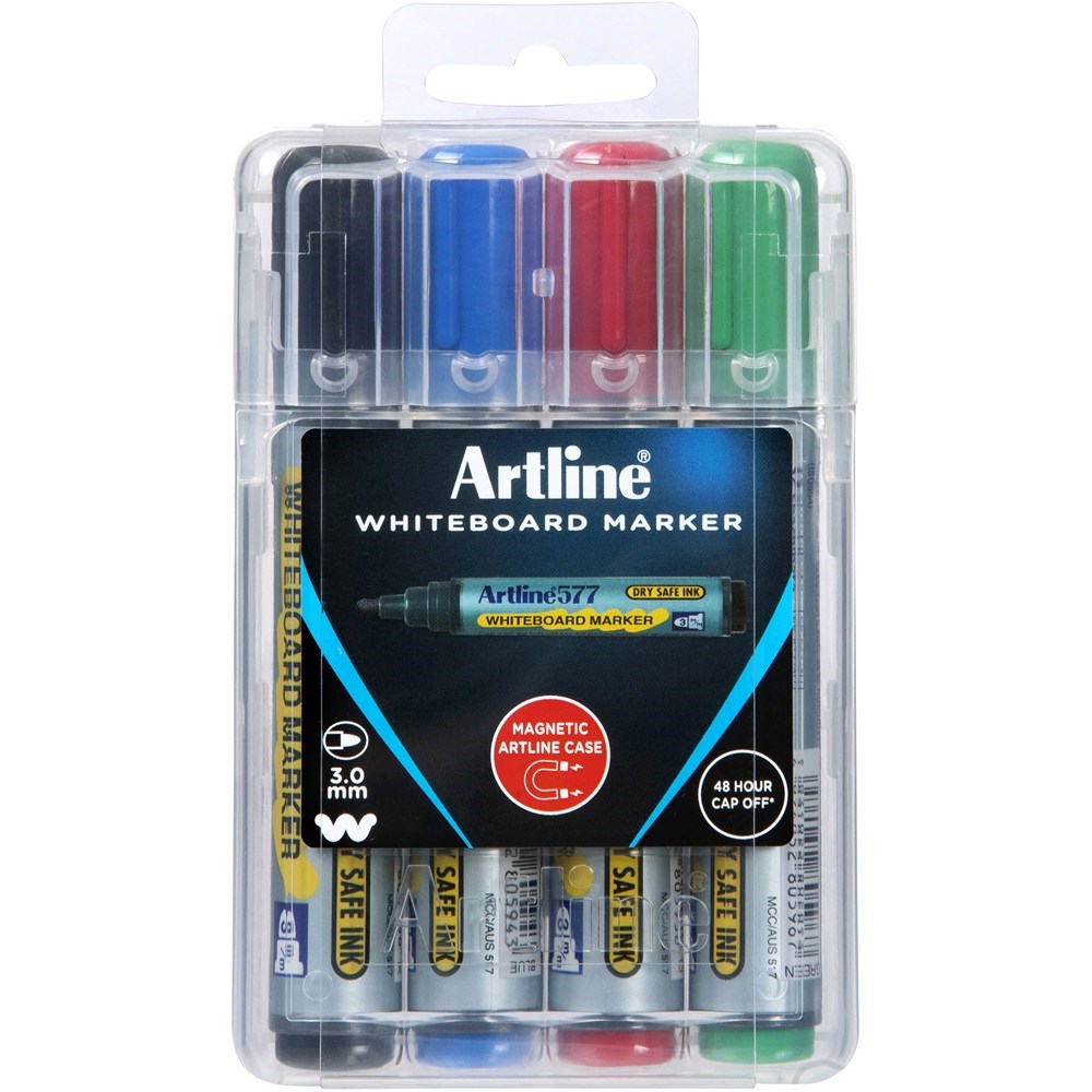 Artline 577 Whiteboard Markers Bullet 3mm Assorted Colours Hard Case Pack Of 4