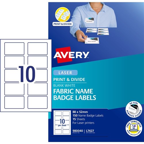 Avery Fabric Name Badge Laser Labels White L7427 88x52mm 10UP 150 Labels 15 Sheets