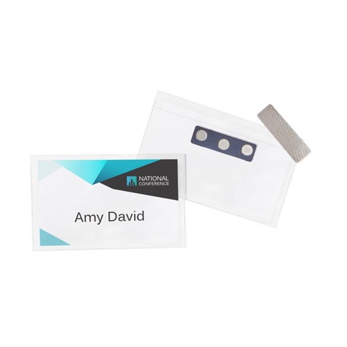 Kit contains 10 reusable magnetic badge holders, 2 sheets of 150gsm printable insert cards, each with 8 perforated name badges.