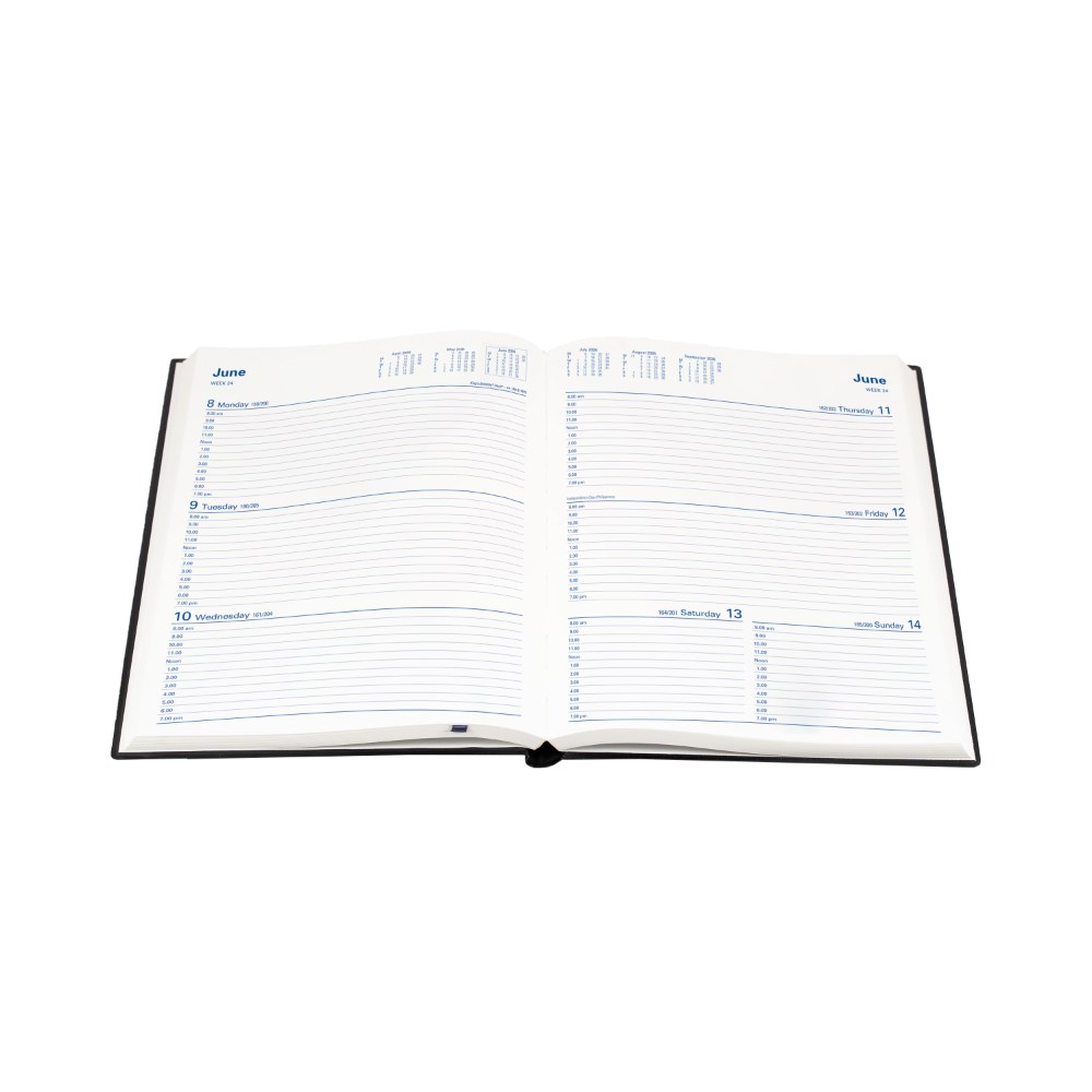 Bound in a highly durable, welded PVC padded cover. Printed on white paper, week numbers, Julian days.