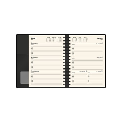 Pen loop, lay flat opening, ribbon marker and week to view layout.