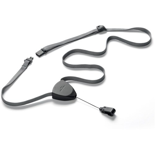 The length of the grey, silky soft textile lanyard is adjustable from 240mm to 500mm.