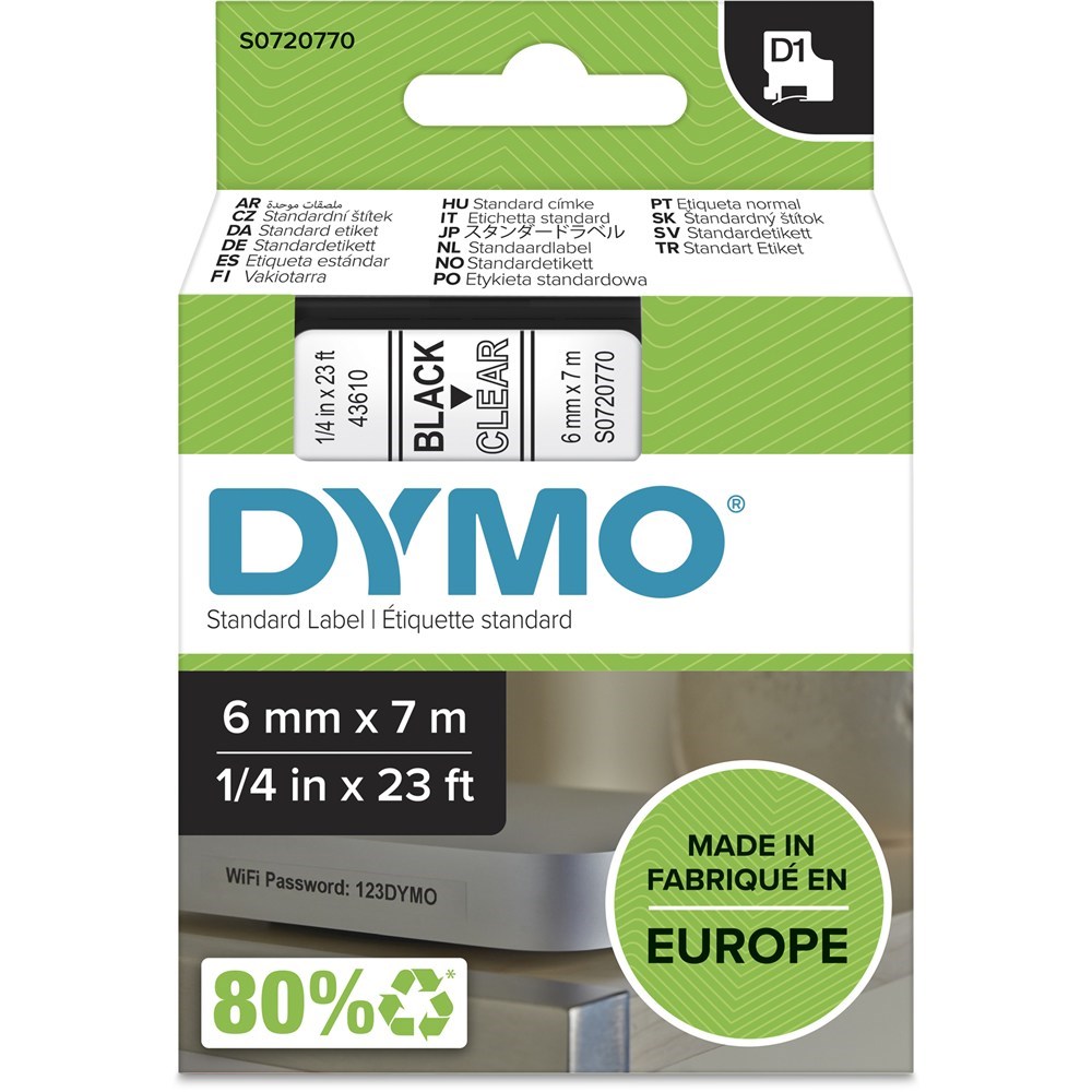 Dymo D1 Label Cassette Tape 6mmx7m Black on Clear