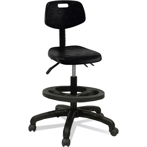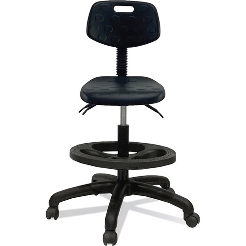 • Composition: Polyurethane Back. Chemical Resistant Seat. 5 Way 640mm Commercial Grade Nylon Base. Twin Wheel Castors.