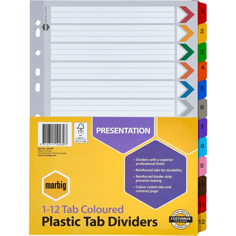 Marbig Plastic Indices & Dividers A4 Reinforced 1-12 Tab Multi Colour