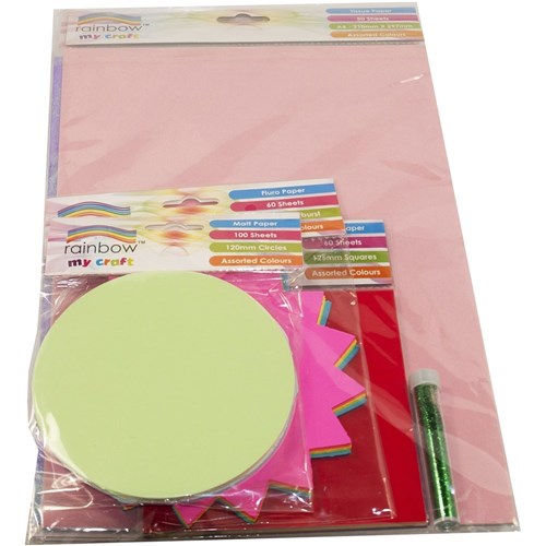 Pack includes assorted A4 paper, shapes (starbursts, circles, squares), A4 specialty paper, 1 x A4 sketch book, 1 x glitter vial and a craft project sheet.