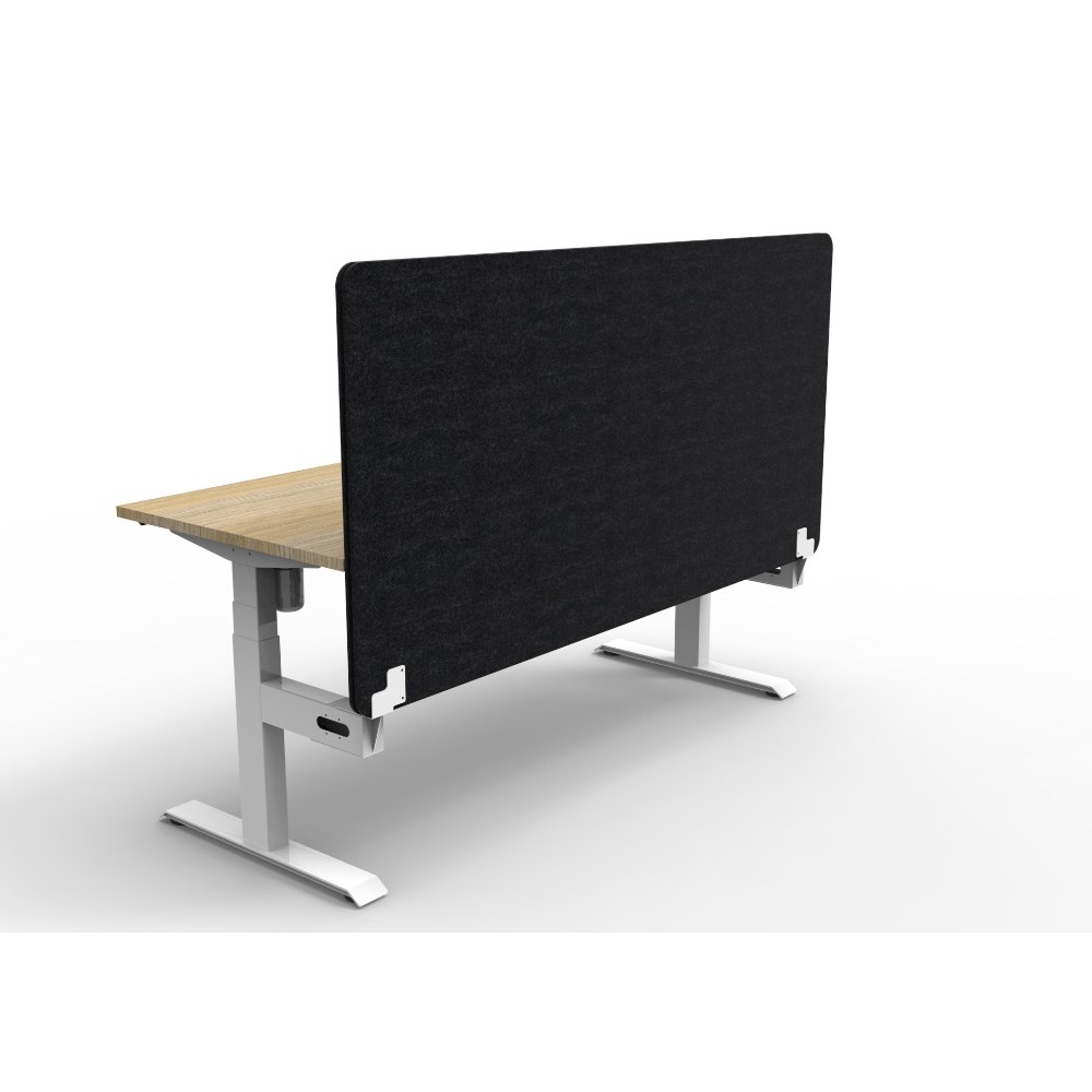 Electric height adjustable single sided workstation with Natural Oak top and White Satin frame, Black Eco screen.
