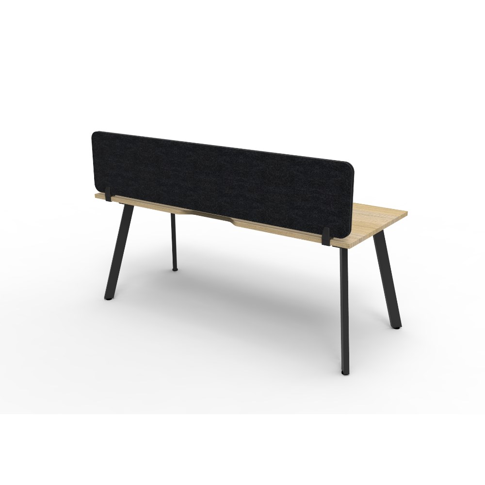Natural Oak worksurface with rigid edging and 410mmW x 50mmD scallop cable access. Black Satin powder coat frame. Eco screen.