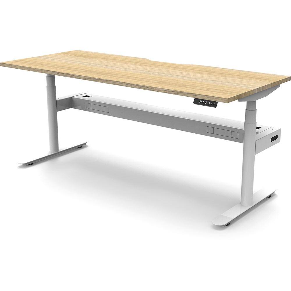 70mm diameter round column legs. 700mm wide foot size with adjustable leveling feet, return foot: 700mm. Comes with cable tray for cable management.