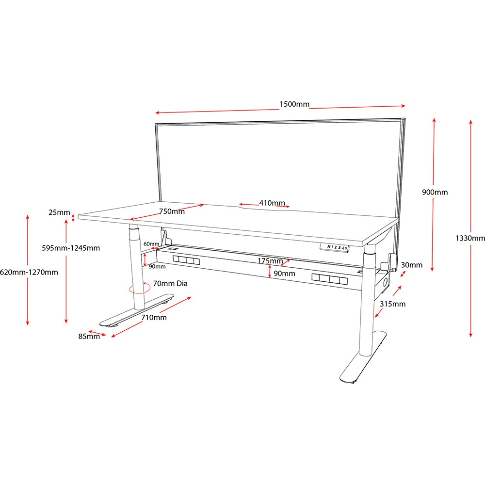 70mm diameter round column legs. 700mm wide foot size with adjustable leveling feet, return foot: 700mm. Comes with 30mm thick privacy screen.