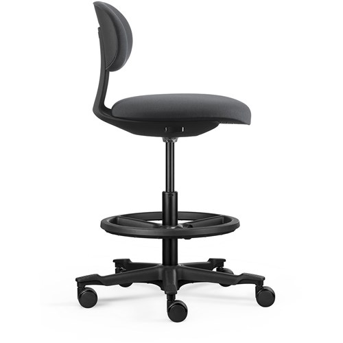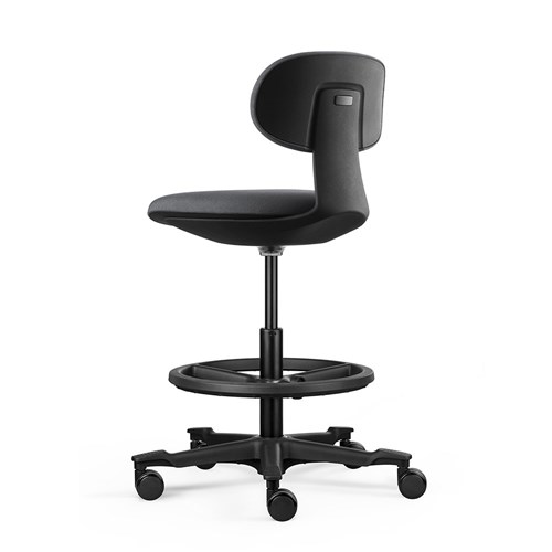 A height-adjustable sit-stand chair. The moulded foam seat and back and the nylon base with castors ensure user comfort and easy mobility.
