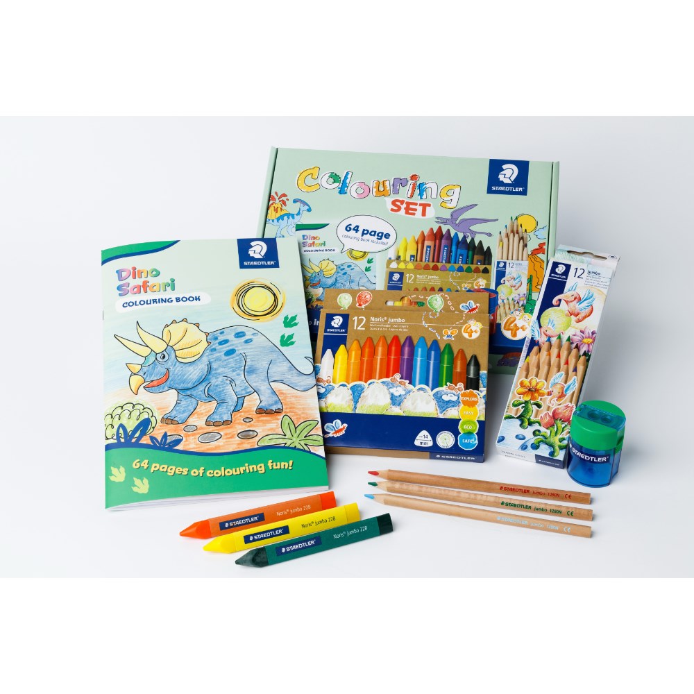 Includes 64 page colouring book, 12 Natural Jumbo Triangular Coloured Pencils, 12 Noris Jumbo Triangular Wax Crayons and 1 Piece Double Hole Tub Sharpener.