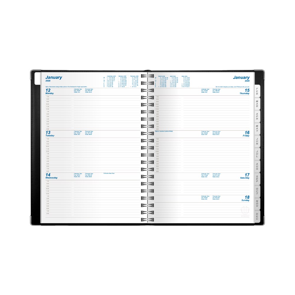 Double wire binding. Lay flat opening. Ribbon marker. Tabs. Translucent pocket.