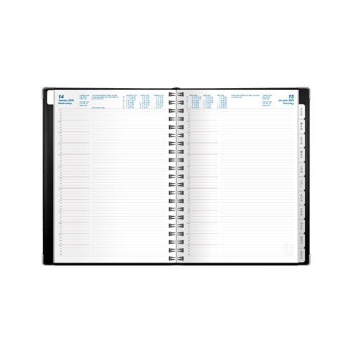 Double wire binding. Lay flat opening. Ribbon marker. Tabs. Translucent pocket.