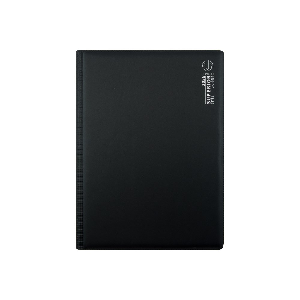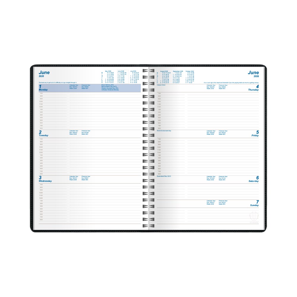 Featuring a padded, phthalate free, PVC cover, pockets for storing business cards and wire-o binding to allow the diary to lie completely flat when open.