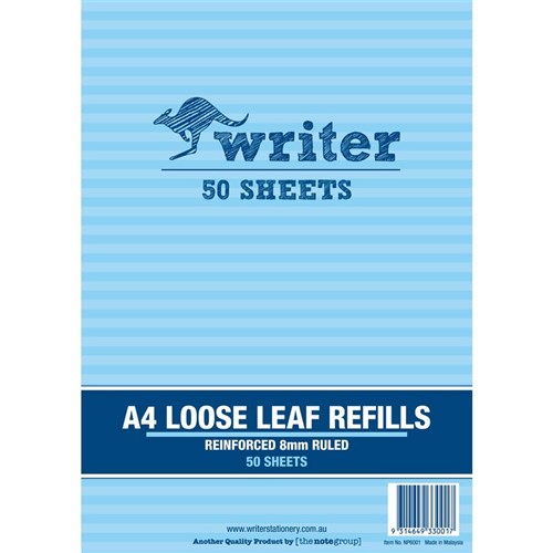 Writer Binder Refills A4 8mm Ruled Reinforced Pack of 50